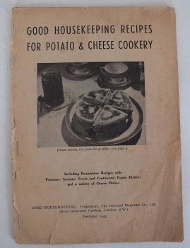 A vintage cookbook titled 'Good Housekeeping Recipes for Potato & Cheese Cookery' is open on a table. The book has a beige cover with a black title and is filled with handwritten recipes. A plate with a potato and cheese dish is placed on the table in front of the book. | WWII Good Housekeeping Recipes For Potato & Cheese Cookery, 1943 Edition | 7df8758b3090fe6b3d4f32ed623404cfe12ff6e7e26c245a18e94cefb66ea89f | 000910703320 | 0 | 0 | 51 | 11 | 0 | 0 | |
