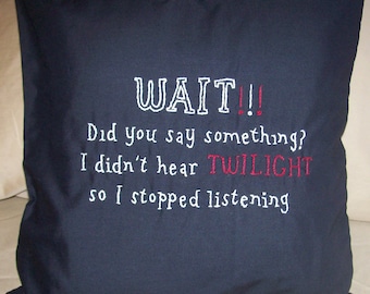 A blue pillow with a white embroidered text that reads 'WAIT! DID YOU SAY SOMETHING? I DIDN'T HEAR TWILIGHT. SO I STOPPED LISTENING.' | Twilight Inspired, Did you say something, Throw Pillow | deff0cb0788c4ef2745c99130b254d547fc2545070e84466d06a3dfff188a2e7 | 000910703349 | 0 | 0 | 23 | 8 | 0 | 0 | |