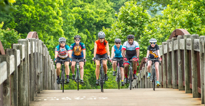 A group of cyclists is riding across a bridge with a forest in the background. The cyclists are wearing helmets and are positioned in a line, with the first cyclist on the left and the last on the right. The bridge has wooden railings on both sides, and the road is marked with white arrows indicating the direction of travel. The cyclists are riding on a path that is part of a larger road. | Registration for Big Dam Bridge 100 Now Open | d86d1e4f9fab141bce8cf4514a61af83ccdc98de6d9ee420ddd4cf4e0c1cda99 | 000910703368 | 0 | 0 | 74 | 8 | 0 | 0 | |