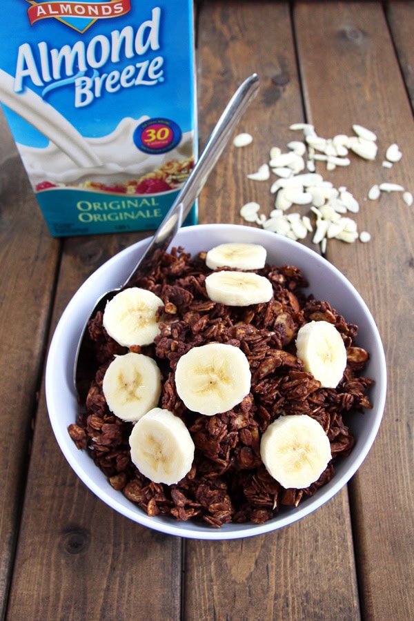 A bowl filled with granola and sliced bananas is placed on a wooden surface. A spoon is resting on the side of the bowl, and there are almonds scattered around the bowl. A carton of almond breeze is also visible in the background. | Bowl of Almond Mocha Granola | 63a3d55e2c08bfaadb9f868852fa7d74c1a5960ce4785c31b5dc0147646372e8 | 000910704165 | 0 | 0 | 43 | 5 | 0 | 0 | |