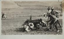A black and white photograph depicts a scene with two men and a horse. One man is standing to the right of the horse, holding the horse's bridle, while the other man is standing to the left, holding the horse's harness. The horse is lying down on the ground, and there is a fence in the background. The image has a vintage feel, with a sepia tone and visible grain. | Postcard of Fallen Horse and Rider | 3ad760ea79967bb353ab930092b68d233d50bdd4fc4335306993e7f865f37beb | 000910704204 | 0 | 0 | 70 | 6 | 0 | 0 | |