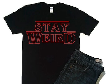 A black t-shirt with the phrase 'Stay Weird' in red, stylized lettering is laid out on a white background. The t-shirt has a white tag at the neckline. Next to the t-shirt, there is a pair of blue jeans with a visible pocket and a zipper fly. | Stranger Things Stay Weird Tshirt, Upside Down Tshirt, Sci Fi, Geek Tshirt, Geek Gift, Indiana Tshirt, Hawkins High School, Eleven Tshirt | a363ed725f45ba057fe1fdadc87481d60514c04a7aa30b6a209102f3ad6f46c5 | 000910704186 | 0 | 0 | 47 | 21 | 0 | 0 | |