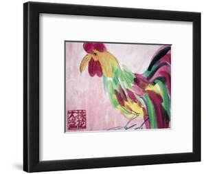 A framed artwork of a colorful rooster with a pink head, yellow beak, and a body with shades of green, yellow, and pink feathers. The artwork is set against a pink background with a white border. Below the artwork, there is a red and white Chinese character. The frame is black with a white matting. | Cock in Pink and Green | 56a7791ddb5ba68d6c6cd774f10e261d334a6174ac375bca69d0a68946ead979 | 000910704086 | 0 | 0 | 55 | 5 | 0 | 0 | |