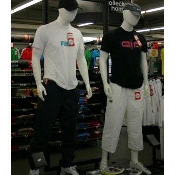 Two mannequins are standing in a store, each wearing a different style of clothing. The mannequin on the left is wearing a white t-shirt with a blue logo and black pants. The mannequin on the right is wearing a black t-shirt with a pink logo and white pants. Both mannequins have white shoes and are positioned on a black platform. The store has a variety of clothing items displayed on racks and shelves in the background. | HOMME MANNEQUIN ABSTRAIT Y650/3 | 9e5bcb0b923e95d0b7986b224849a49b99d1b14699d3fd482b8d0519c8c7164c | 000910704257 | 0 | 0 | 76 | 4 | 0 | 0 | |