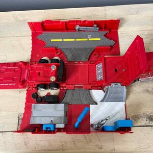 A red toy car with a yellow stripe is displayed on a wooden surface. The car is positioned on its side, with its wheels and doors open, revealing the interior. The car is part of a larger toy set, as evidenced by the presence of other toy parts and accessories around it. | Disney Pixar Cars Mack Semi Truck Playset Fold Up 2014 Mattel | bf99bdf7fe55b4a97d6ceb49255449e1d62ef9bab57d3ced6bd7efa5fe96a051 | 000910704329 | 0 | 0 | 52 | 11 | 0 | 0 | |