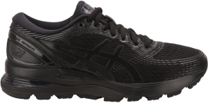 A black sneaker with a textured upper and a white sole is displayed against a white background. The sneaker features a black tongue with a white logo, black laces, and a black heel counter with a white logo. The sneaker has a mesh-like pattern on the upper and a rubber outsole with deep grooves for traction. | Running shoes Asics GEL-NIMBUS 21 | ec85f52fa0a769d49a443b85d1963c9f9ee1c9e13dcf06b1205df4ee9fd59ae5 | 000910704262 | 0 | 0 | 56 | 5 | 0 | 0 | |