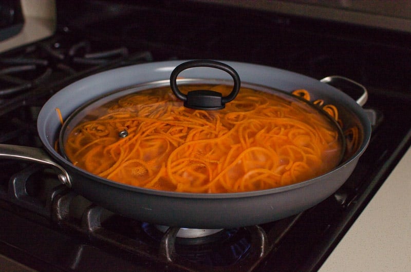 A pot filled with orange noodles is placed on a stove burner. The pot has a black handle and a lid with a black knob. The stove has a black surface with visible burners and a control knob. The pot is positioned on the right side of the stove, and the burner is turned on, with flames visible beneath the pot. | skillet with sweet potato noodles covered with lid | 138103bd72c08ffa2061cb83b977115864b778a4985c50c0af625b52e69c5a26 | 000910704306 | 0 | 0 | 61 | 8 | 0 | 0 | |
