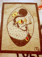 A stylized illustration of a man with a beard and sunglasses, wearing a fur-lined coat and a crown, is depicted in a circular frame. The man is smoking a cigarette, and there is a cloud of smoke above his head. The illustration is on a textured surface with a brownish background, and there is graffiti visible in the bottom right corner. | rockabilly poster by taxis | 0e36fcb6f11d4995d691cba3e99db74300e36843bec3c34aaaf873bf8899834e | 000910704374 | 0 | 0 | 61 | 4 | 0 | 0 | |