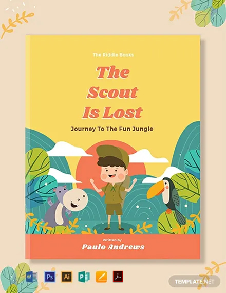 A children's book cover titled 'The Scout is Lost: Journey to the Fun Jungle' with a young boy in a green uniform and a cap, surrounded by jungle animals and foliage. The cover features a warm color palette with shades of yellow, orange, and green. The title and author's name are prominently displayed at the top and bottom of the cover, respectively. The book is part of 'The Muddle Books' series, and the cover includes icons representing the book's design elements, such as a pen, a paintbrush, and a computer monitor. | Free Kid's Adventure Book Cover Template | 9dce04cbcd099a12412e1093fbe890327402ce0738824b2bb96c2cad6a02d657 | 000910704368 | 0 | 0 | 91 | 6 | 0 | 0 | |