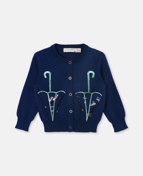 A blue cardigan with a large, colorful umbrella design on the front, featuring a white handle and a blue and green canopy. The cardigan has a ribbed collar, cuffs, and hem, and is adorned with colorful buttons and a small, colorful bird design on the left side. | Lauren Umbrella Cardigan | ce534560f0757f75df62ba154eb1a55ae8ad5f0d747af18ae3f2d27154ccbb8c | 000910704333 | 0 | 0 | 47 | 3 | 0 | 0 | |