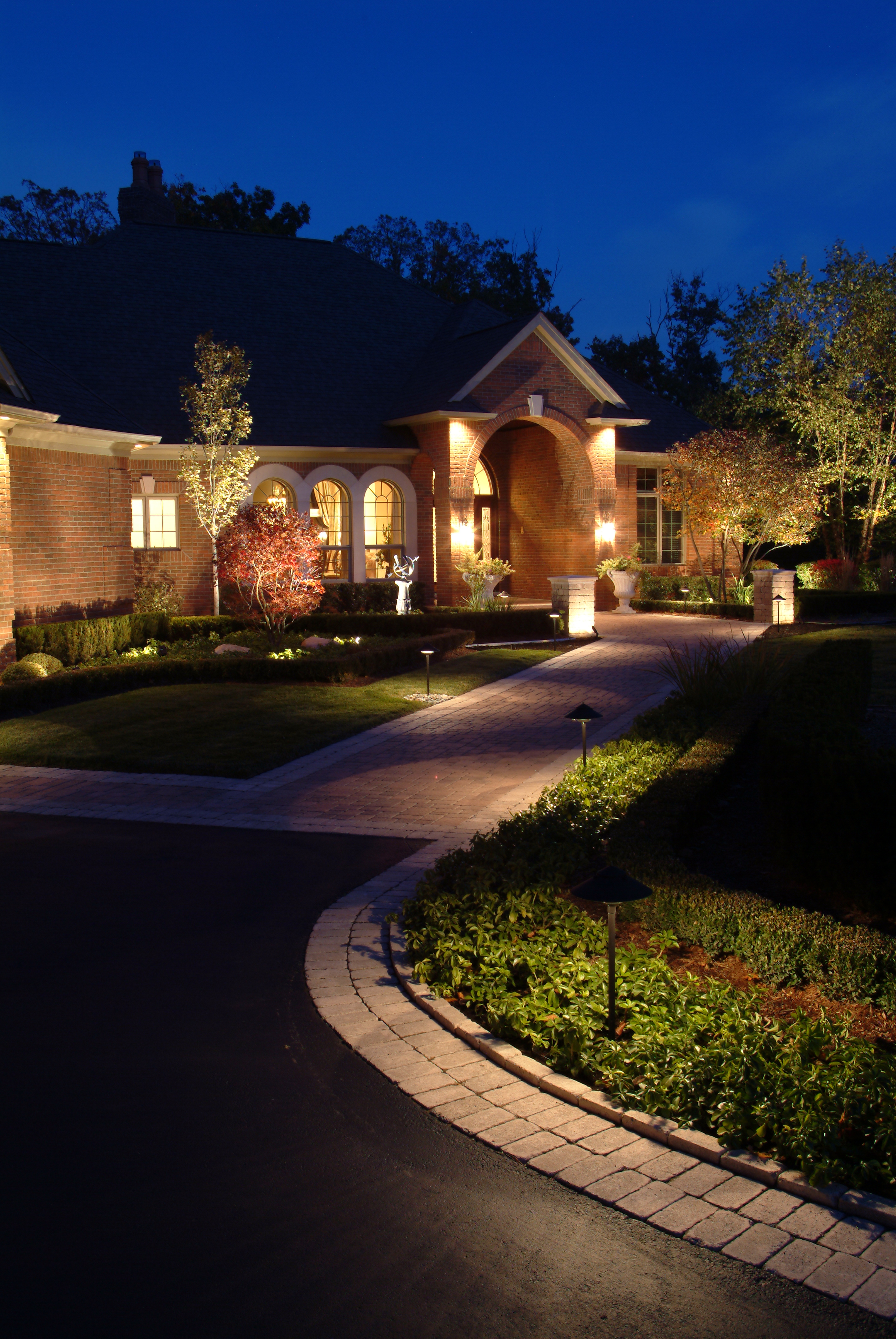 A well-lit suburban home at night with a driveway leading to the house. The house has a brick facade with a brown roof and is surrounded by a manicured lawn and garden. There are trees and bushes around the property, and the driveway is bordered by a white stone curb. The house is illuminated by warm lights, and there are street lamps along the driveway. | Beautiful Outdoor Lighting | 5f4a6ac3a11edd4764977a04e2b22b86131f6284731ee7298aab0a5842cbfbc8 | 000910704375 | 0 | 0 | 65 | 3 | 0 | 0 | |