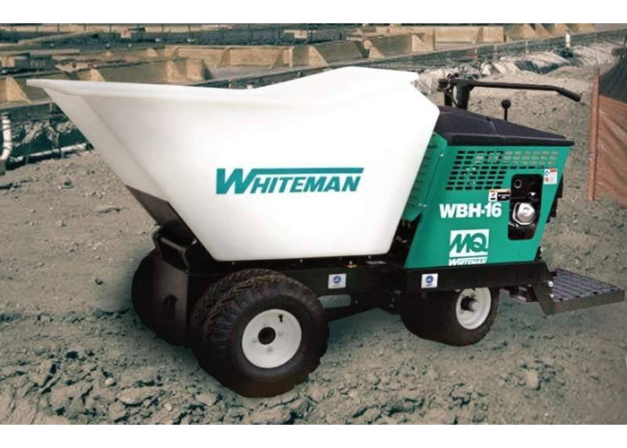 A white and green compact tractor with a large bucket attached to the front is parked on a construction site. The tractor has a prominent 'WHITE-MAN' logo on the side and is labeled 'WQ-16'. It is equipped with a hydraulic arm and a bucket, and there is a hose connected to the side. The ground is covered with dirt and rocks, and there are buildings in the background. | 16CF Concrete Buggyimage 1 | 01adc4a2b6081ccf87b0c85f3d562fc7f71f220d1e41c8f1520b14603b57881d | 000910704582 | 0 | 0 | 68 | 4 | 0 | 0 | |