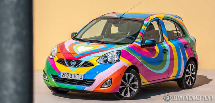 A small, colorful car with a heart-shaped design on the front is parked in front of a yellow wall. The car has a unique, multicolored paint job with a mix of bright colors such as red, blue, yellow, and green. The license plate reads '2 272 HRT'. The car is positioned at an angle, showing the side profile, and the background is a plain, light-colored wall. | Nissan Micra | 580c604be7d698674bfca3eb37bc733c377acf484a916301c487672e7cd37d58 | 000910704510 | 0 | 0 | 66 | 2 | 0 | 0 | |