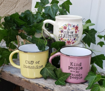A collection of three ceramic coffee mugs with floral designs and inspirational quotes are arranged on a wooden surface. The mugs are surrounded by green ivy leaves, and the quotes read 'Cup of Clarity', 'Kindness with People', and 'Sunshine'. The mugs are in shades of white, pink, and yellow, with the white mug being the largest and the yellow mug being the smallest. | Natural Life Ceramic Mugs | 6896ea28e9a0c19c11d299d912d8543a62537fd3f60edca171cdaba5b8772609 | 000910705392 | 0 | 0 | 63 | 4 | 0 | 0 | |