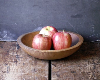 A wooden bowl filled with two red apples sits on a wooden table. The apples are shiny and have visible stems. The bowl is placed on a dark surface, and there is a shadow cast to the right of the bowl. | Vintage Bird's Eye Maple Munising Round Wood Dough Bowl | 9de6b248f5d148388f9c3365f7e498d20c6a81d118a9323f047a3a7b66b8ddf9 | 000910705040 | 0 | 0 | 41 | 9 | 0 | 0 | |