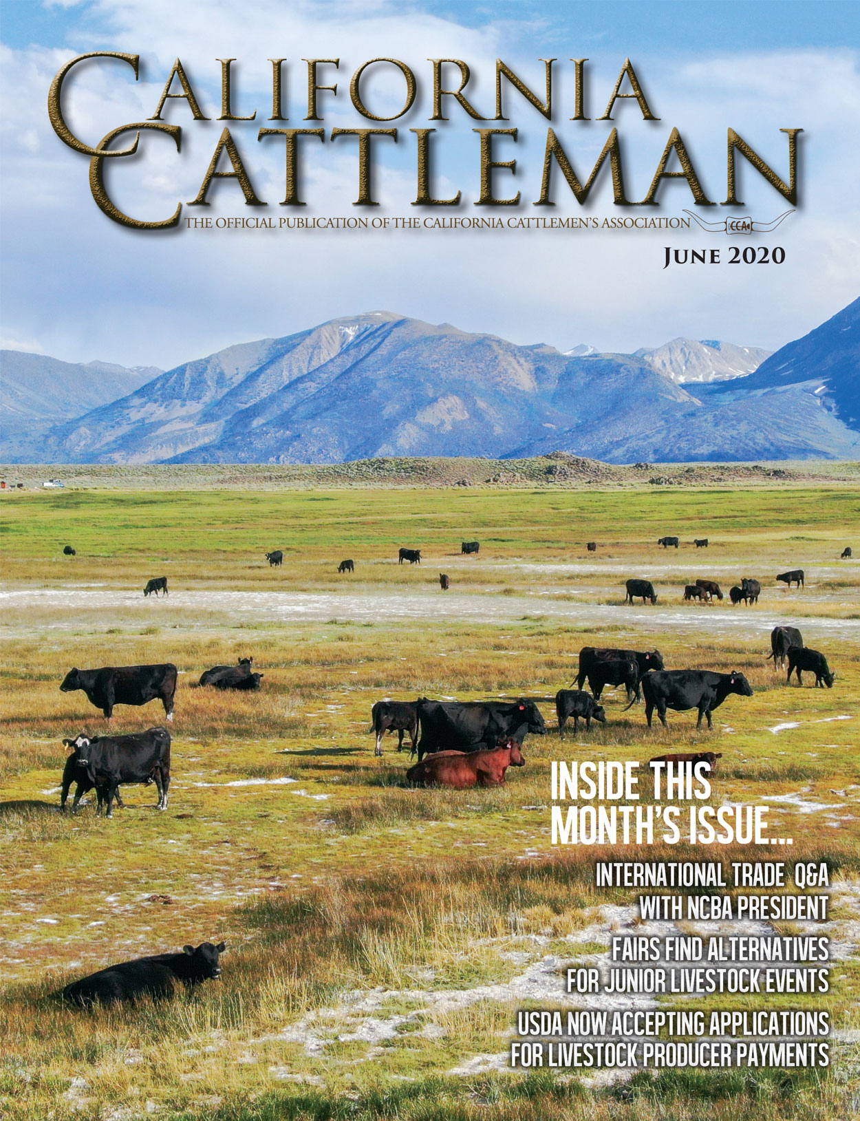 The cover of California Cattlemen magazine features a vibrant image of a grassy field with numerous cattle grazing. In the background, there are majestic mountains under a clear blue sky. The title 'CALIFORNIA CATTLEMEN' is prominently displayed at the top, with the subtitle 'The Official Publication of the California Cattlemen's Association' below it. The date 'June 2020' is visible in the top right corner. The magazine's logo is at the top left corner, and the tagline 'Inside This Month's Issue' is at the bottom. The article title 'International Trade: Ongoing Challenges and | June CCA Magazine cover of cowboy | 6a57ff46d3d642d6d8475a09e3b4d617143104fac42d032791aeb5f9ae395def | 000910705794 | 0 | 0 | 92 | 6 | 0 | 0 | |