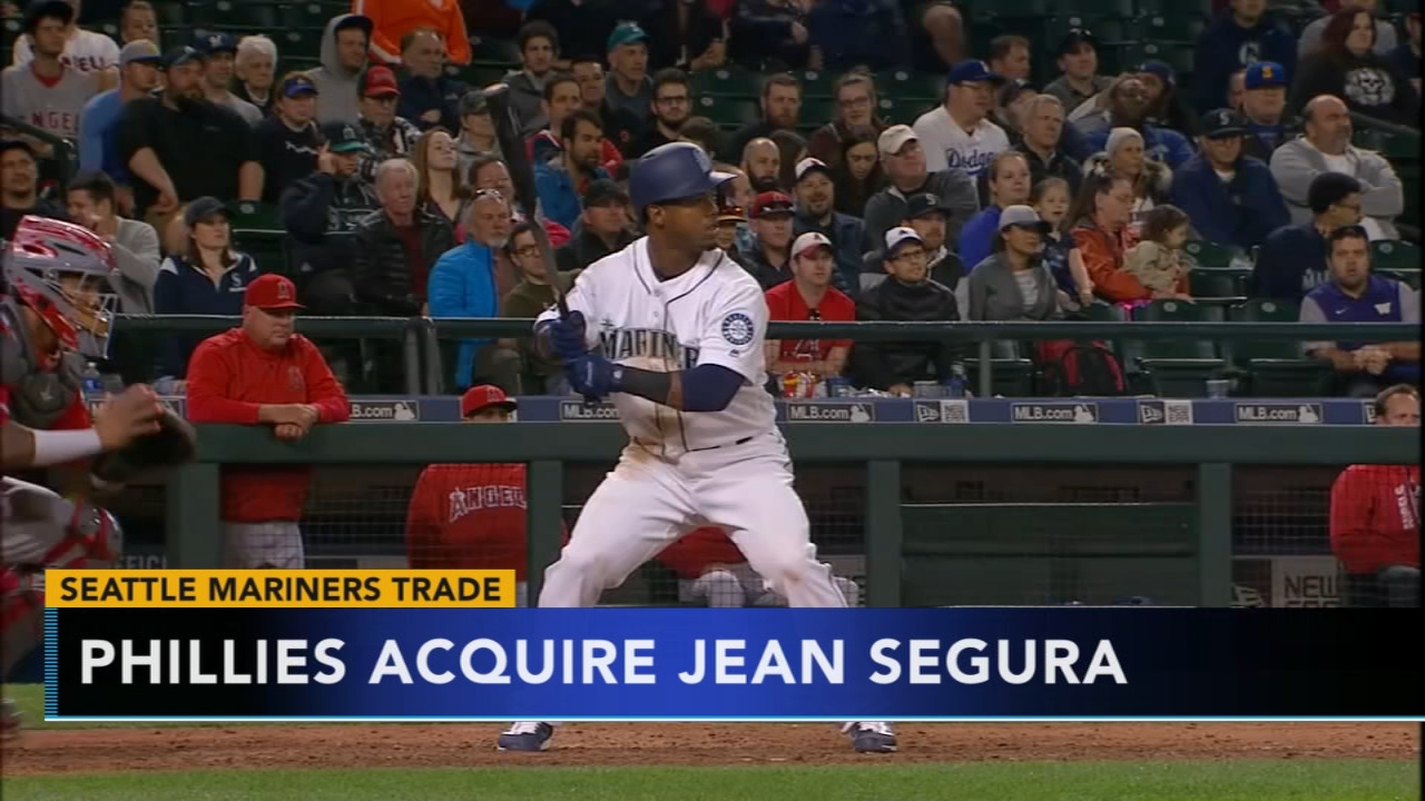 A baseball player in a white uniform with the number 2 and a blue cap is standing on a baseball field. The player is holding a baseball bat and appears to be in a batting stance. In the background, there is a crowd of spectators in the stands, and the text 'SEATTLE MARINERS TRADE PHILLIES ACQUIRE JEAN SEGUERA' is displayed on the screen. | Phillies acquire Jean Segura. Matt ODonnell reports during Action News Mornings on December 4, 2018. | 18f8959297e45c3f50519fe3f7a0e1e9f508a534cdb1a045e4b4851a938d85f3 | 000910705812 | 0 | 0 | 63 | 15 | 0 | 0 | |