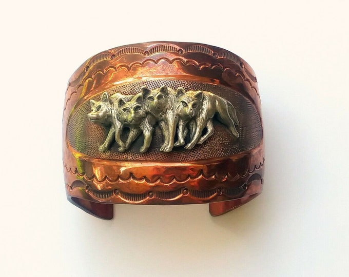 A close-up of a vintage copper bracelet with a detailed embossed design of a pack of wolves in the center, set against a white background. | Rare Hard To Find! - Chaco Canyon, Copper & Sterling Silver Wolf Pack, Wide Cuff Bracelet | c98cfb1f3e29f8bd1adb776fd0c460f47283dffddb985ed103496ae9a8d14c49 | 000910705897 | 0 | 0 | 25 | 16 | 0 | 0 | |