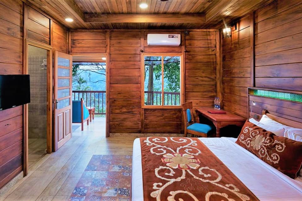 A cozy bedroom with wooden walls and flooring. The room features a bed with a brown and white patterned bedspread and a matching pillow. There is a wooden nightstand with a red lamp and a small blue stool next to it. A flat-screen TV is mounted on the wall to the left of the bed. The room has a large window with a view of greenery outside, and there is a small air conditioner unit on the wall above the window. | Summit Bird's Valley Resort & Spa, Kunjithani, Summit Bird's Valley Resort Spa | 374d15d72e799ff18a2393b5cfd1a02d5a0e946a0c2a7a5d8c861b43f036e1e8 | 000910705782 | 0 | 0 | 81 | 12 | 0 | 0 | |