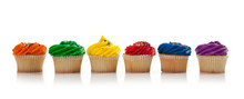 A row of six cupcakes with colorful frosting is displayed against a white background. The cupcakes are lined up in order of their frosting colors, starting with red on the left and ending with purple on the right. Each cupcake has a swirl of frosting on top, and the frosting colors are arranged in a gradient from red to purple. The cupcakes are placed on a surface that reflects the light, creating a subtle shadow to the right of each cupcake. | Assorted Colored Cupcakes With Sprinkles On White | 60907a055818c0461cb56bc04582d93fcfbe2ca4135f189a96e518c6635f7e02 | 000910686954 | 0 | 0 | 81 | 7 | 0 | 0 | |