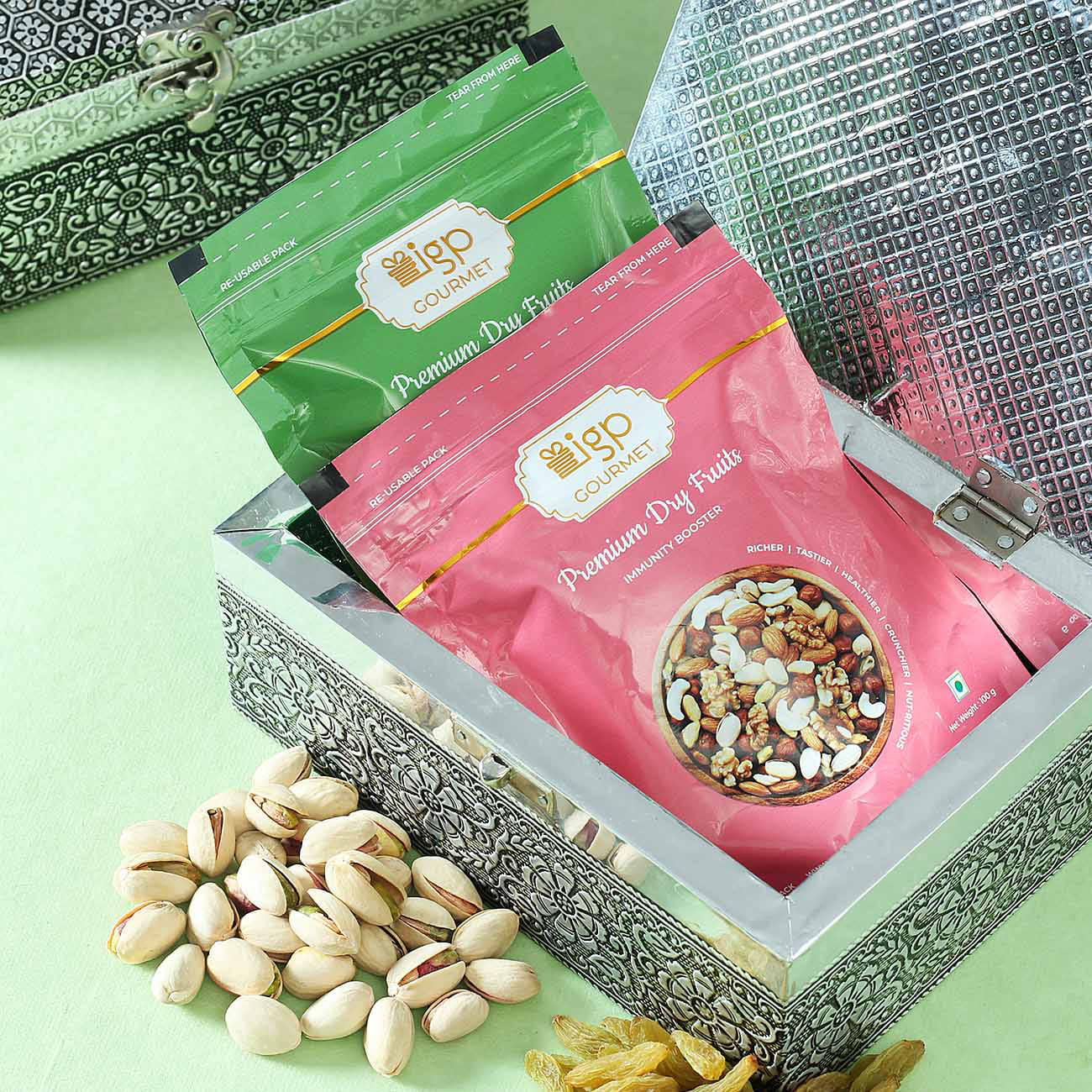 A silver metal box with a mesh design is open, revealing a pink and green bag of nuts inside. The box is placed on a green surface, and there are scattered nuts around it. | Buy Set of 2 Semi Precious Stone Rakhi with Dry Fruits in Designer Box | 73341afc53a0cadf0d5f2a7a264695205756082aa48b9aed0c1afb9ffcc7c39f | 000910686972 | 0 | 0 | 34 | 14 | 0 | 0 | |