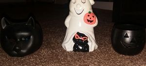 A black cat figurine is placed on the left side of the image, with a white pumpkin-shaped figurine featuring a ghostly face in the center, and a black pumpkin-shaped figurine on the right side. All three figurines are on a carpeted floor. | Ceramic Halloween tea light candle holders | ae6811aee87aed6ae2b2efeaa6c1873623ae569fad3240373e171e6b0b1193c9 | 000910686980 | 0 | 0 | 42 | 6 | 0 | 0 | |