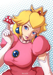 A stylized illustration of a female character with blonde hair, wearing a pink dress with a white collar and a large bow on her head. She has blue eyes and is pointing with her right hand. The character is wearing a pink dress with a large pink bow on the back, and there is a mushroom with red spots in the background. | Peach - Super Mario Bros - by Salaiix | ff8e7c5d4bb14da0461e2e7df89ab99c6f558799ec019819afa06144e03697be | 000910706195 | 0 | 0 | 62 | 8 | 0 | 0 | |