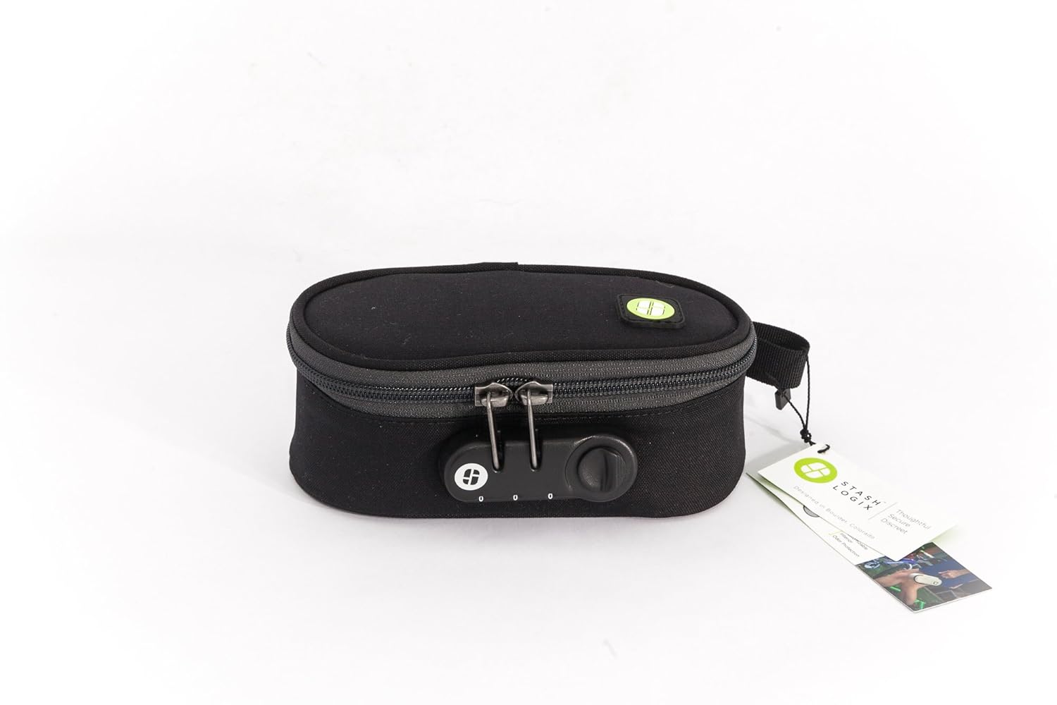 A black rectangular camera case with a zipper closure is displayed against a white background. The case has a small green logo on the upper right corner and a tag with a green logo and text attached to the bottom right corner. | ESH Locking Stash Bag with Odor Control STASHLOGIX EcoStash Medium, Hemp | faeb944e724b6a889ac1f8c9e4653f680e97480827ddb25affa6a430ac436792 | 000910706607 | 0 | 0 | 42 | 11 | 0 | 0 | |