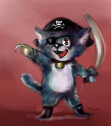A stylized, cartoon-like character with a pirate theme is depicted. The character has a large, expressive eye and a wide, toothy grin. It is wearing a black pirate hat with a skull and crossbones emblem, a red bandana, and a gold ring on its finger. The character is holding a sword in its right hand and a hook in its left hand. The background is a solid red color, and the character casts a shadow on the ground. | pirate cat by MinAhVanilla | 537e75d83a64fab3bbe1ebb4b61cdf9c9762e3e9f9fe2eb691eca43af6a82e85 | 000910706582 | 0 | 0 | 78 | 4 | 0 | 0 | |
