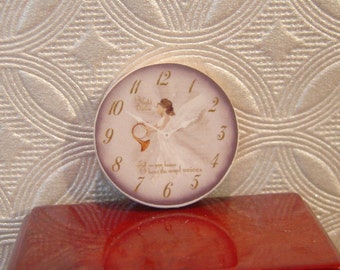A vintage-style clock with a white face and gold numbers is hanging on a textured wall. The clock features a whimsical illustration of a woman in a white dress with wings, holding a tennis racket, and the words 'Tennis Angel' written above her. The clock is placed on a red surface with a reflective quality, possibly a polished wooden table. | Miniature Dollhouse Angel Clock One Inch Scale 1:12 | 5769ca0013e515d8178145b7d246418915bd4e41761cae9026369e8766028347 | 000910706638 | 0 | 0 | 60 | 8 | 0 | 0 | |