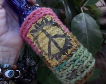 A close-up of a person's hand holding a blue bottle with a knitted cover featuring a peace sign design. The bottle is partially covered by the knitted cover, and the person is wearing a bracelet with a charm on their wrist. The background shows a blurred green leafy plant. | Hippie Beer, Beer wrap, beer holder, bottle cooler, can cooler, beer cozy, hippie gift, peace sign, festival crochet,C13, cheers, | f3dd6632e8174512da3231c44fc1049deb919489e69114fc05edc84e77d627f1 | 000910706608 | 0 | 0 | 49 | 19 | 0 | 0 | |