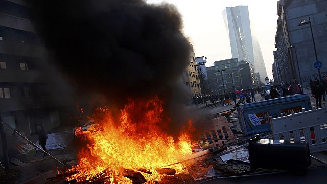 A large fire is burning on a city street, with thick black smoke billowing into the air. The fire is surrounded by debris, including a trash can and a wooden pallet. People are walking on the sidewalk, some carrying backpacks, and a traffic light is visible in the background. | Germany: Violence flares at anti-austerity protest against new ECB headquarters | dd01b2733072be336d7b6e507b0a894c698603ea6eaca1e72febe03c86069e41 | 000910706664 | 0 | 0 | 49 | 10 | 0 | 0 | |