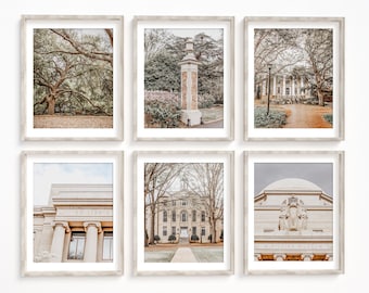 A collection of six framed photographs is arranged in a square formation. Each frame contains a monochromatic image of a different scene. The top left frame shows a large tree with a thick trunk and sprawling branches. The top right frame depicts a classical monument with a column and a statue on top. The bottom left frame features a building with a dome and columns, while the bottom right frame shows a statue with a column and a dome. The middle left frame displays a tree with a thick trunk and bare branches, and the middle right frame shows a building with a dome and columns. | University of South Carolina Gallery Wall Art Print or Canvas Set. Carolina Gamecocks Print Set of 6. Black & White or Sepia also Available. | 2e711f9a297410f6d55259c2442e5e6e8038bfa1a54c110f36fae608f5cd25e0 | 000910706594 | 0 | 0 | 106 | 24 | 0 | 0 | |