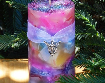 A colorful candle with a purple and blue gradient and a glittery texture is placed on a wooden surface. The candle has a silver butterfly charm tied to a purple ribbon around its middle. The candle is surrounded by green pine needles, and the background features a blurred green pine tree. | Faerie Worlds . Ambrosia Candle 2x3 . For Faerie Magick, Sight, Nature Spirit Workings, Joy, Play, Enchantment | dcf6b2638ba64ed261bb561cdbc7eaf90caf71d943a2d820a66b13aeac8e6329 | 000910706713 | 0 | 0 | 51 | 17 | 0 | 0 | |