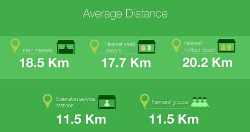A green background with a series of icons and text blocks. The icons include a map pin, a building, a seedling, and a farmer's market stall. The text blocks provide information about the distance to each location, with the first block stating 'Average Distance' and the subsequent blocks showing the distance to each of the other locations. The text is in a large, bold font. | Good road networks to facilitate smallholders to access agricultural and seed markets is critical for higher food production both for consumption and investment. Source: CIMMYT | fa5679d26ff5f303e6bd466e12bf5d8272881d80e28e82f4cc8bb99e0fd8e504 | 000910706704 | 0 | 0 | 65 | 25 | 0 | 0 | |