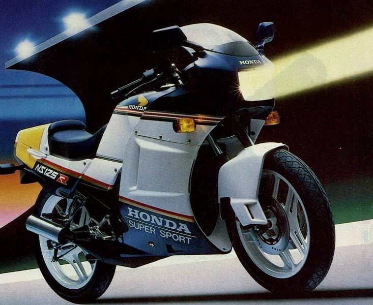 A white and blue Honda motorcycle with a black and yellow helmet on the seat is parked on a white surface with a blue and orange gradient background. The motorcycle has a black and yellow stripe running down the middle, and the word 'SUPER' is written in blue on the side. The front wheel is visible, and the motorcycle is positioned at an angle, with the front facing slightly to the left. | Honda NS125R (1987) | ad18365973a8582c6c15a73897af51ba3c42372bd0def948a1b77881b2c72e0e | 000910706721 | 0 | 0 | 72 | 3 | 0 | 0 | |