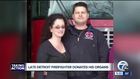 A man and a woman are standing in front of a fire truck. The man is wearing a black jacket with a red emblem on the left side, and the woman is wearing a black top. They are both smiling and posing for a photo. The fire truck is red and white, and there is a blurred background with a red and white pattern. | Gift of life from firefighter who died on job | 74dcb98a311ce20073ab5373073bcda4e1d7e5c6350eb15a1aba79404e5b69c4 | 000910707067 | 0 | 0 | 64 | 9 | 0 | 0 | |