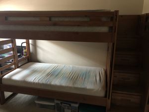A wooden bunk bed with a striped blanket on the bottom bunk is in a room with a white wall and a wooden floor. There is a storage box at the foot of the bed and a chair with a backpack on it to the left of the bed. | *Used* Twin Size Bunk Bed (Comes with 2 Mattresses) for Sale in Navarre, FL | 405602971672223afa076b6033faae7b3b4fb79ad57fc615bfb9756fd2393ed2 | 000910706989 | 0 | 0 | 49 | 14 | 0 | 0 | |