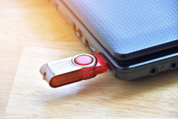 A red USB flash drive is plugged into a black laptop on a wooden desk. | red flash drive in port usb with computer notebook. | d32f1f3b77007991735a221e50b390f1612bb181c170403539c77d6ae02f627e | 000910707069 | 0 | 0 | 15 | 9 | 0 | 0 | |