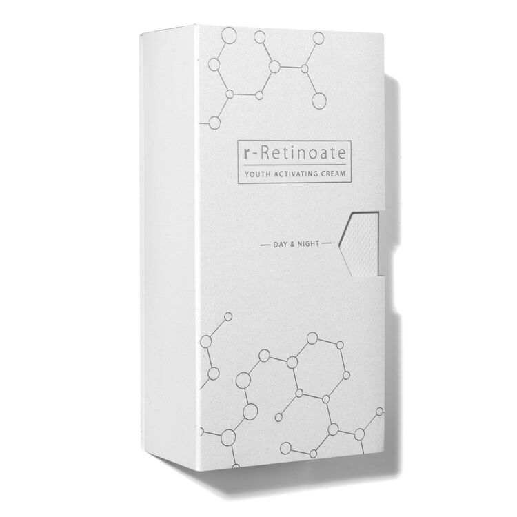 A white box with a black molecular structure design on the front. The box has the text 'F-RETINATE' at the top and 'YOUTH ACTIVATING CREAM' below it. There is a black and white diagram of a molecular structure on the left side of the box, and the text 'DAY & NIGHT' is written in black on the right side. The box casts a shadow to the right, indicating a light source from the left. | r-Retinoate Day & Night, , large | 33cc01b1f5a08a643e04bb3f4963c5326a294047ca9f46aaa6480fb96310d04b | 000910707053 | 0 | 0 | 74 | 6 | 0 | 0 | |
