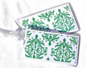 Two identical green and white patterned lanyards are lying on a white surface. The pattern features intricate designs with swirls and leaves. The lanyards are positioned side by side, with the top lanyard slightly overlapping the bottom one. | Damask luggage id tags, green and white women's travel tags, set of 2 travel accessory, women's id tags, suitcase tags, luggage tags | 59e4042d035cf8607f3502138e5e7f701bf24b3c093aa24441ba030952a95f22 | 000910687094 | 0 | 0 | 38 | 22 | 0 | 0 | |