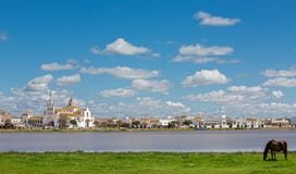 A brown horse stands in a grassy field with a body of water in the background. The sky is blue with scattered clouds, and there are buildings and a church visible in the distance. | El Rocio Stock Photography | 0bc001f0b846e5b9aaeb7c37d53e0dd9f2ba477394e07d0e74c9432f8672501a | 000910687106 | 0 | 0 | 34 | 4 | 0 | 0 | |