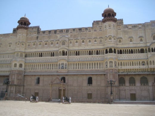 A large, ornate building with multiple domed towers and a long, arched facade. The building has a series of windows and doors, some of which are open, revealing a glimpse of the interior. The architecture suggests a historical or cultural significance, possibly a palace or a museum. The sky is clear and blue, and the building is set against a backdrop of a clear sky. | Junagadh fort - Bikaner | b4f000f43db47dca10585d16e0fc0fcd88fb0627c88e34d834455bc57dfab22d | 000910687030 | 0 | 0 | 65 | 4 | 0 | 0 | |