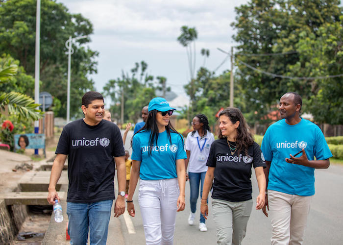 A group of people is walking down a street. In the foreground, there are three individuals: a man wearing a black shirt with the word 'UNICEF' on it, a woman in a blue shirt with the same logo, and another man in a blue shirt. Behind them, there are several other people, including a woman in a white shirt and a man in a blue shirt. The setting appears to be a sunny day with clear skies. | During their visit to Rwanda in 2020, UNICEF USA and NextGen visit a family in Rubavu District to learn how community health workers educate communities on Ebola prevention. | 4fb4ae2347ef5113d3dde794b3be88a3d9266c20b63c2d67a530a5d9d336d693 | 000910687069 | 0 | 0 | 77 | 28 | 0 | 0 | |
