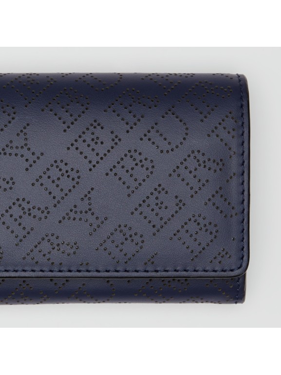 A blue leather wallet with a textured pattern and a gold-tone zipper closure. | Perforated Logo Leather Continental Wallet in Navy - Women | Burberry - cell image 1 | 3e646f60d8d0a13251da341ecd14c0c7a15e7681933057e729da1f94777e8b11 | 000910708263 | 0 | 0 | 13 | 15 | 0 | 0 | |