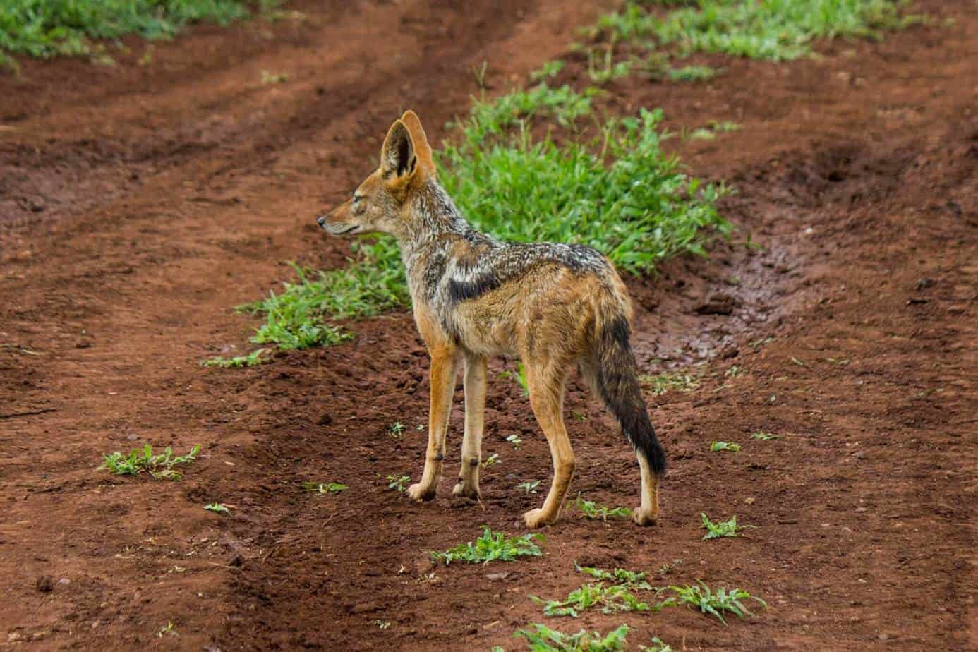 A small brown and white spotted jackrabbit stands alert on a dirt road surrounded by green grass and a few scattered weeds. | Black-backed Jackal @ Thanda Private Game Reserve. Photo: H\xc3\xa5vard Rosenlund | 3085456105aa4510d9933ec02156070ce0826d131b463b44a456ef6cf0fa18fd | 000910708196 | 0 | 0 | 22 | 10 | 0 | 0 | |