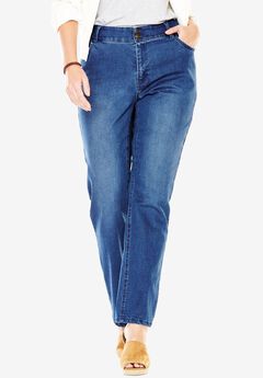 A woman is standing with her hands on her hips, wearing a white jacket over a grey t-shirt, blue jeans, and brown sandals. | Straight Leg Tummy Tamer Jean, | bf3dfc416081d91713c17016dd520ccb3f3973caabb094a4b29f918050c49772 | 000910708295 | 0 | 0 | 23 | 5 | 0 | 0 | |