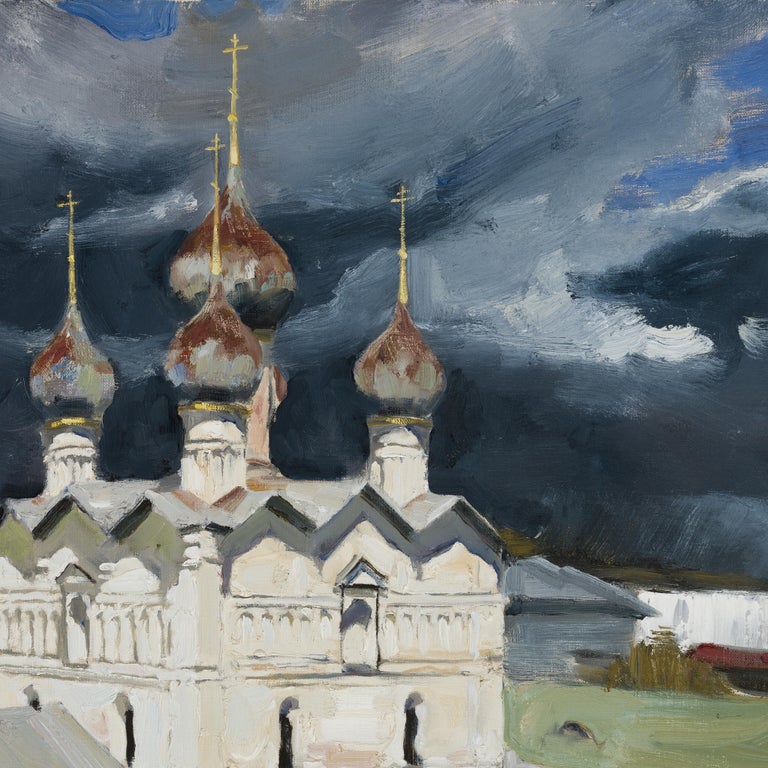 A painting of a church with multiple domes and spires, set against a backdrop of a cloudy sky. The church is depicted in a style reminiscent of a Van Gogh painting, with bold brushstrokes and a vibrant color palette. The sky is filled with dark, swirling clouds, and the church is illuminated by a light source from the upper left corner, casting shadows and highlights across its surface. | In this impressive canvas, Ilya Zorkin showcases the Rostov Kremlin standing strong in face of a thunderstorm. With the stark tonal contrast and powerful composition, the artist poetically and harmoniously juxtaposes the architectural panorama with | 4448a753790b2ecf0fbded24a4632f419c062819b80da274283d8e12c8bbb662 | 000910708558 | 0 | 0 | 68 | 35 | 0 | 0 | |