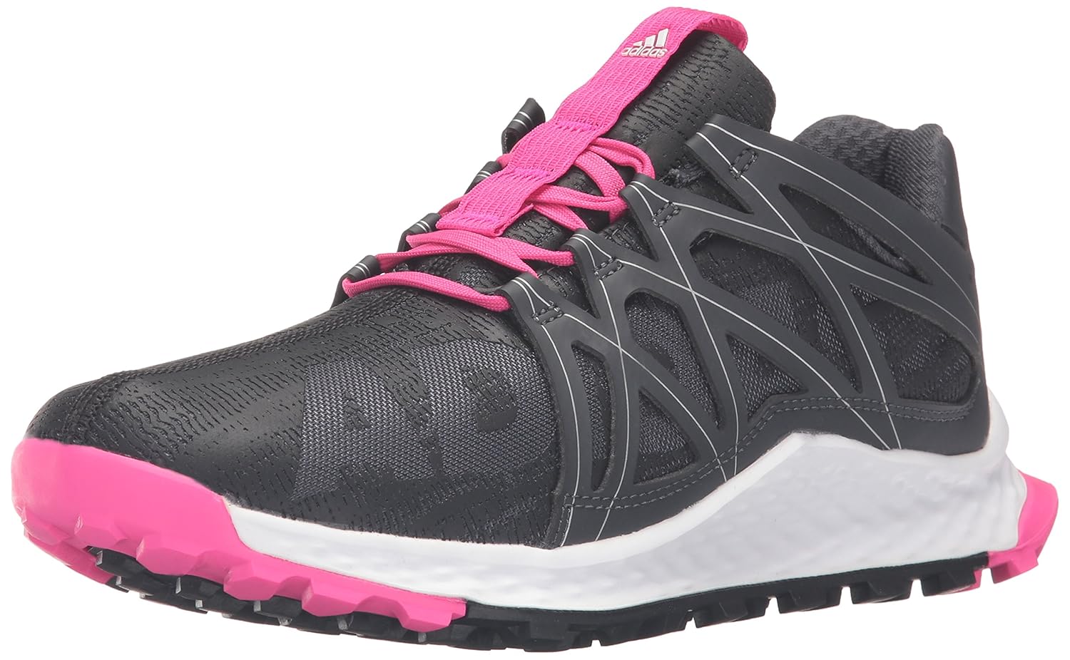 A close-up of a black and pink Adidas sneaker with a white sole. The sneaker features a black upper with a textured pattern and pink accents on the heel and toe. The laces are pink with black tips, and the sneaker has a sleek design with a modern look. | adidas Women's Vigor Bounce W Trail Runner B01B3RUZZS 9.5 B(M) US|Dark Grey/Black/Shock Pink S | 8163c2bfd3e879ca7890ebdf0ed916c4574f3e51ed7578a467f2f5538b325a2c | 000910708649 | 0 | 0 | 49 | 14 | 0 | 0 | |