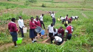 A group of schoolchildren in uniforms are working together to dig a hole in a field. They are using shovels and buckets to remove dirt and fill the buckets with water. The children are standing in a line, with some holding buckets and others digging. The field is surrounded by a lush green landscape with tall grass and a few trees in the background. | The Water Project: Fetching Water | 6db777eb970cee56731b7055fac110613eb05d9a19c25d31c40da495a4f3cc1e | 000910708727 | 0 | 0 | 64 | 5 | 0 | 0 | |